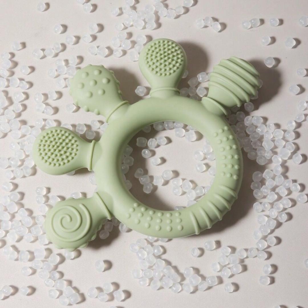 Avec ses cinq extrémités texturées aux reliefs variés, il masse délicatement les gencives douloureuses tout en éveillant la curiosité tactile de votre tout-petit. Fabriqué en silicone alimentaire 100 % sûr et sans BPA, cet anneau est doux, souple et parfaitement adapté à la bouche des bébés. Sa forme ergonomique facilite la prise en main, même pour les plus petites mains.